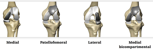 The Inner (medial), outer (lateral), front (patellofemoral) parts can all be replaced individually. Rarely a surgeon may want to replace 2 of the 3 parts at the same time (Bi-compartmental replacement).