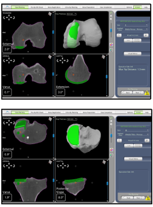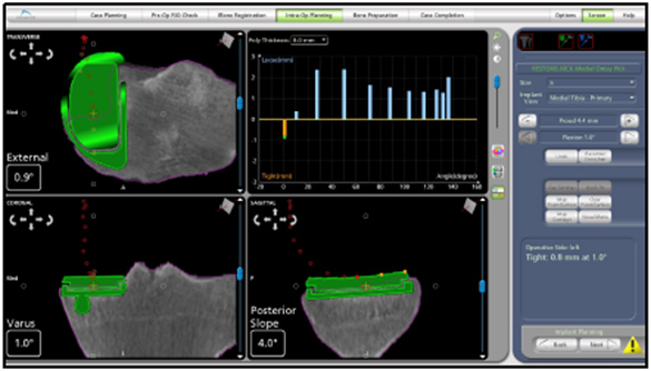 The knee is then put through a series of movements and the tension in the ligaments is measured and the movement of the knee is observed and the contact points between the components recorded. This produces a graph of the knee and a 3D model of how the knee will work after the replacement. The surgeon can then adjust the planned component position to change any aspect of the plan they want to improve.