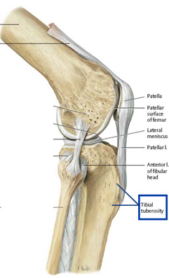 The tibial tubercle is the insertion point of the patella tendon. This is found below the kneecap (patella) on the